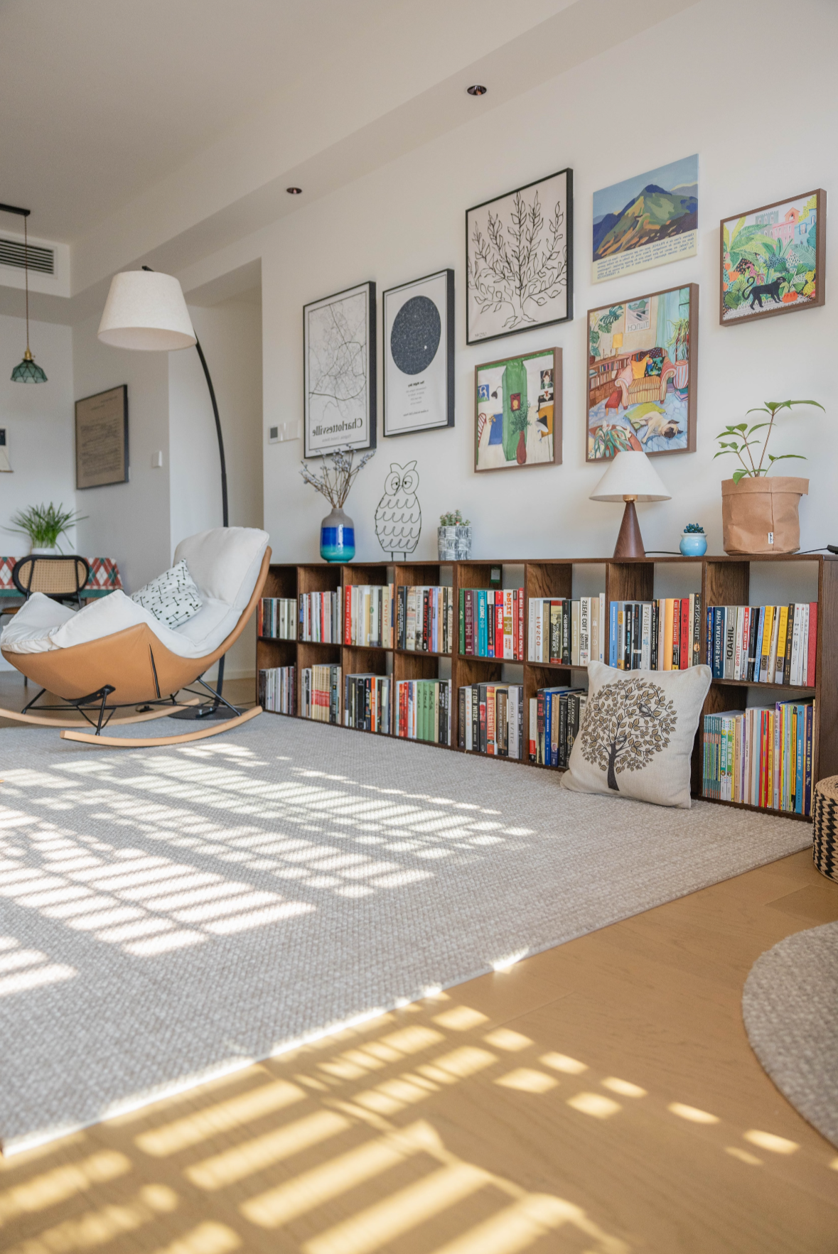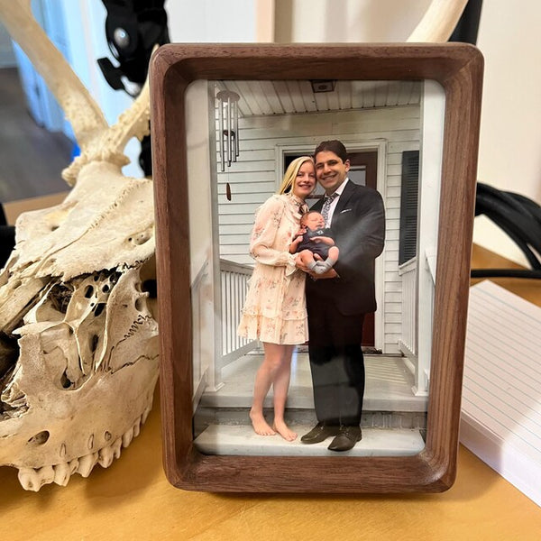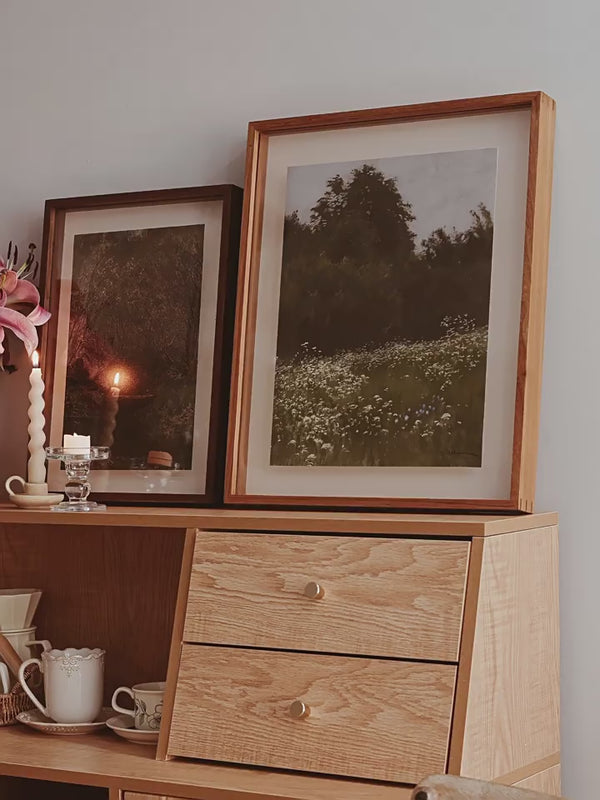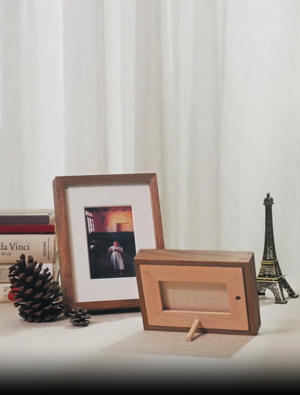 Light woods, float‑style mounts, and non‑glare acrylic for an airy, calm look. White ash and walnut frames keep shelves and low walls serene and uncluttered.