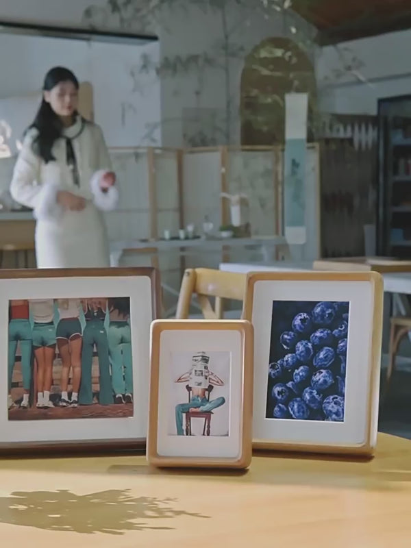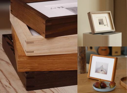 Build a stairway story with mixed sizes and finishes. Start with Tenon solid‑wood frames, add slim aluminum pieces, and layer mats for a museum‑style wall.