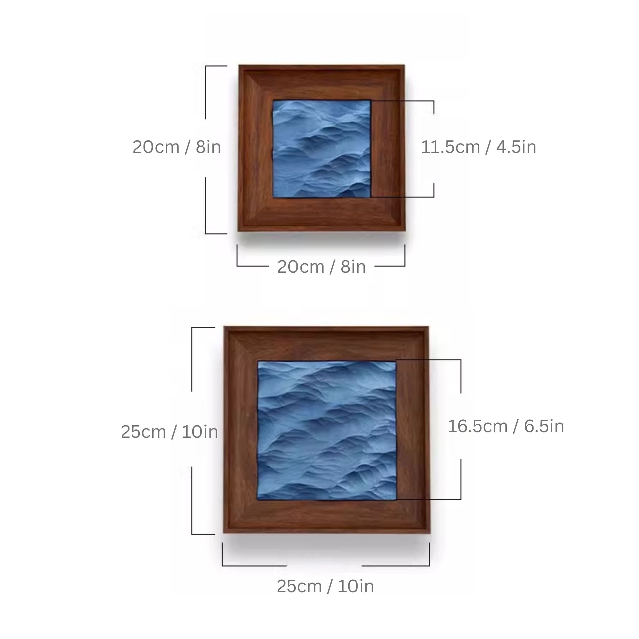 Carved by hand, cast in plaster, and painted in layers of ocean blue, this sculptural wall piece captures the movement and stillness of water in a single moment. Every wave is shaped uniquely—no molds, no repeats—so your artwork will be distinctly yours.