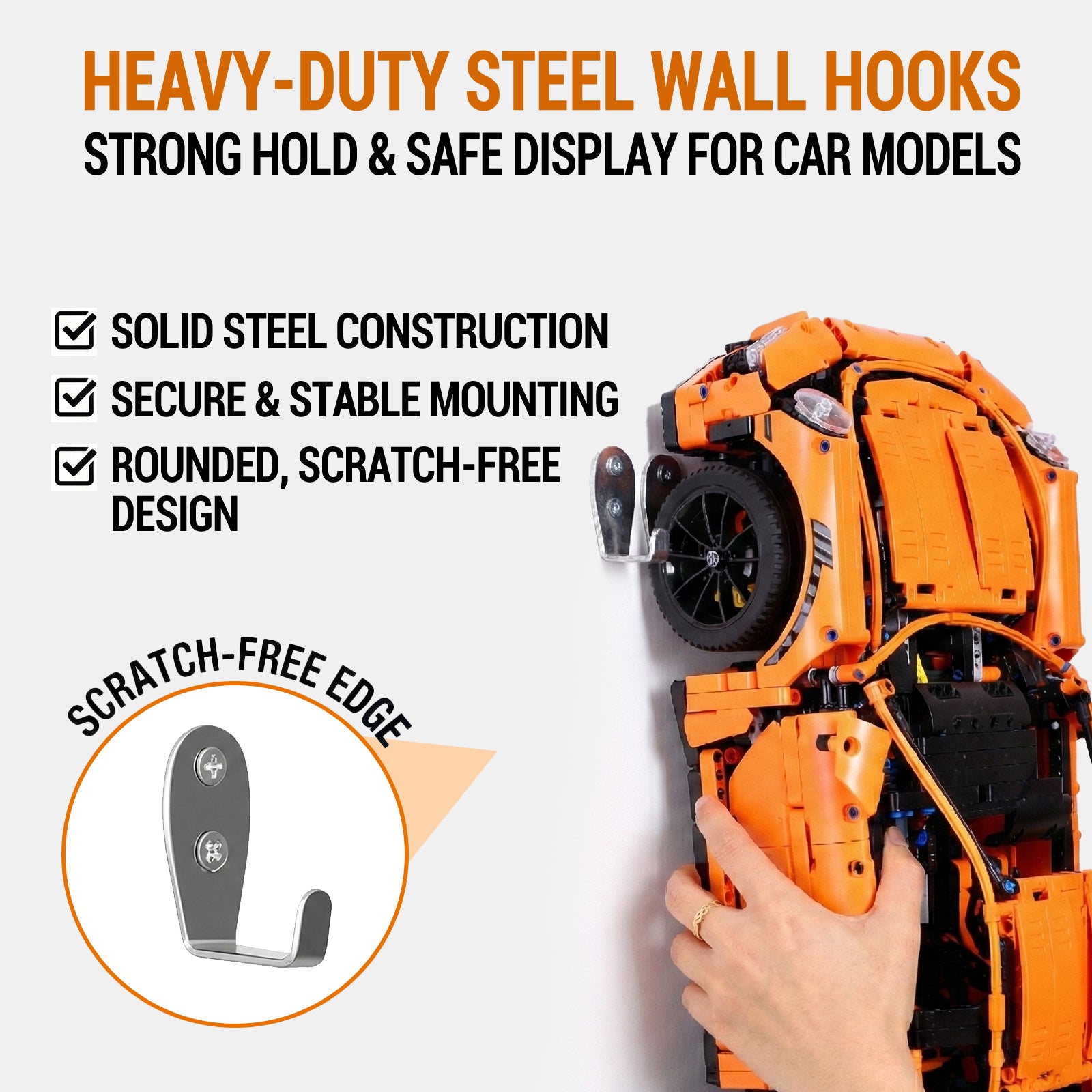 - Custom Fit Hook – Secure hook holds your car model firmly in place to prevent falling