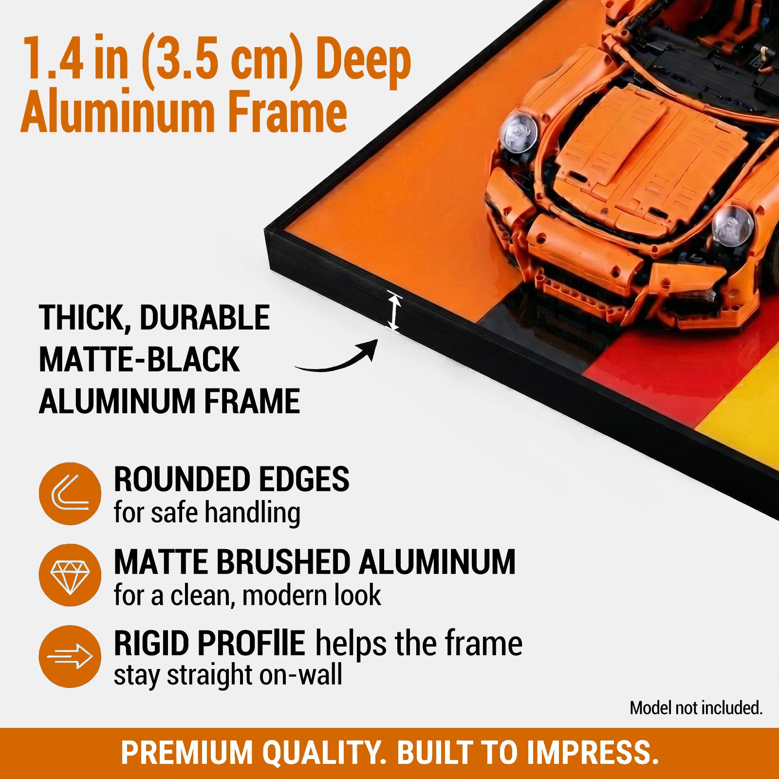 This orange aluminum alloy wall display frame is custom-designed for your LEGO® Porsche 911 GT3 RS (Set 42056). With its striking orange finish, this stand is the perfect way to highlight your build and elevate your LEGO® Technic™ car collection.